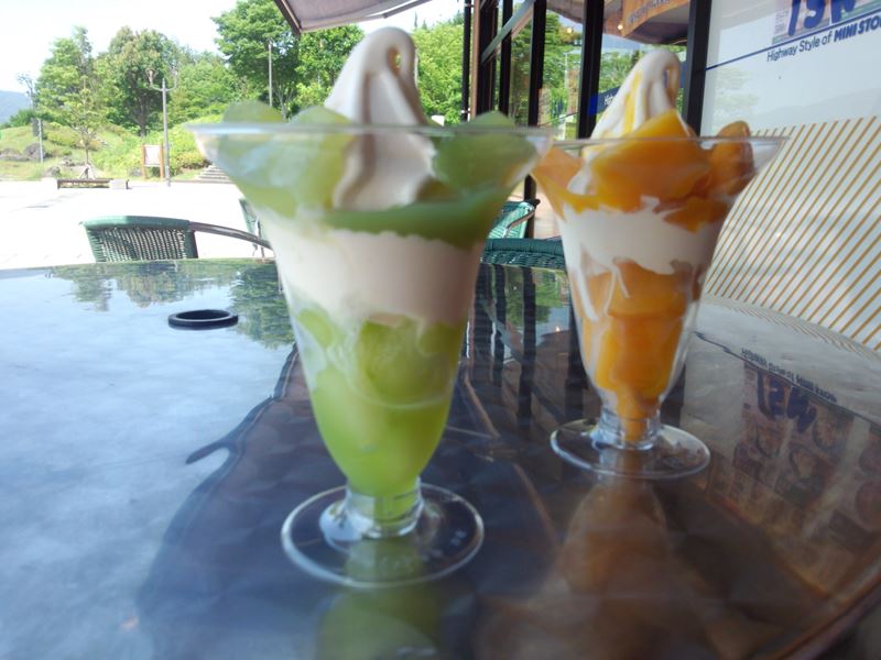 まずは、高速のサービスエリアのミニストップに寄り、女房とメロンパフェとマンゴーパフェを。