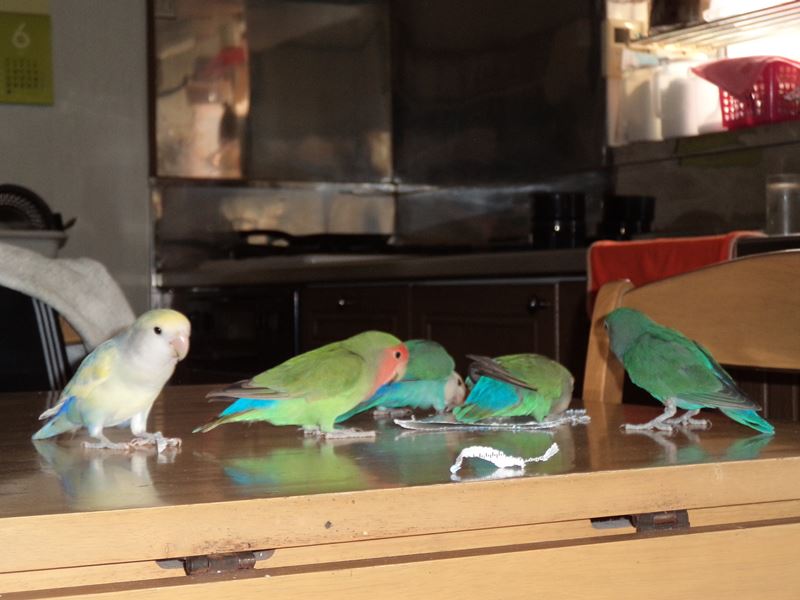 連れて帰ったら、我が家のコザクラ軍団とオカメ軍団。