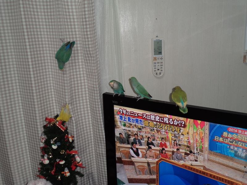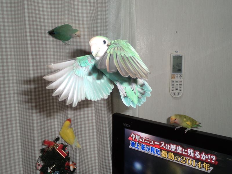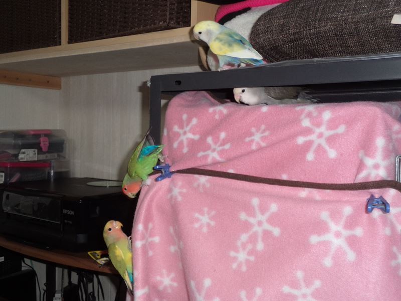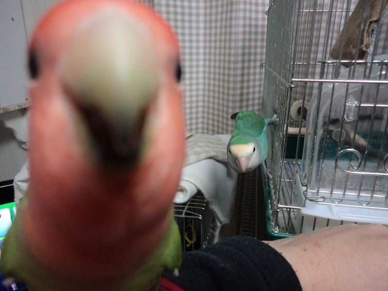 2回目の放鳥で、我が家のコザクラ軍団と一緒に放鳥。