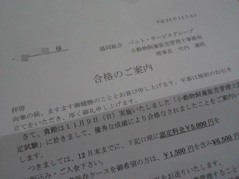 おぉ、11月に試験を受けた、小動物飼養販売管理士の合格通知が来たようで。