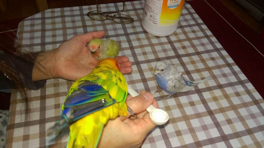コガネメキシコインコのつくしさんと、羽衣のころもさんが寄ってきて邪魔します。