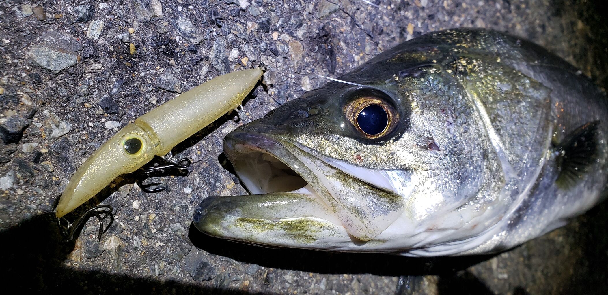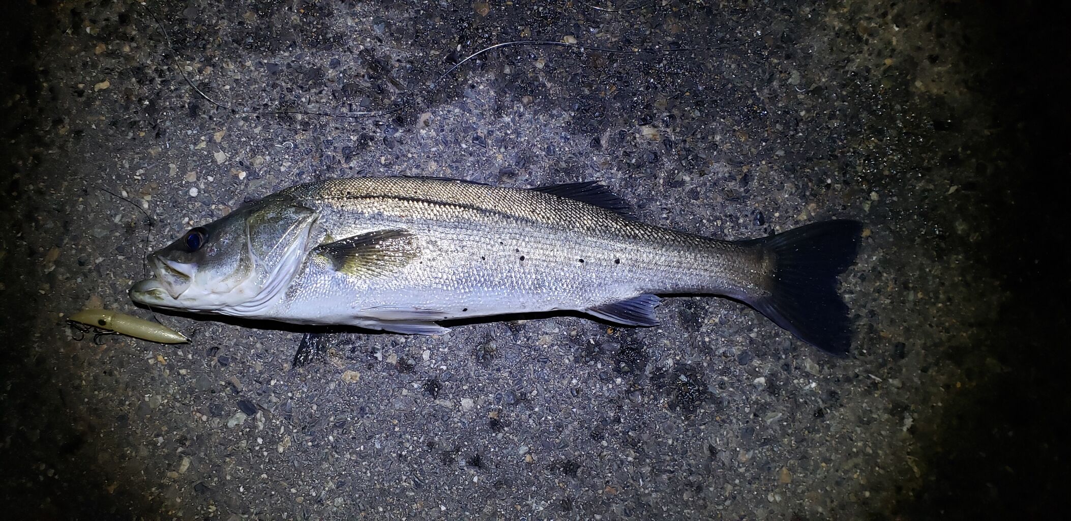 あちゃー、もつれてらと思い回収中、まさかの鱸サイズがヒット。